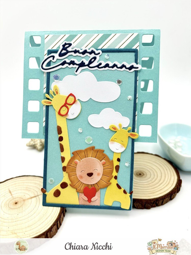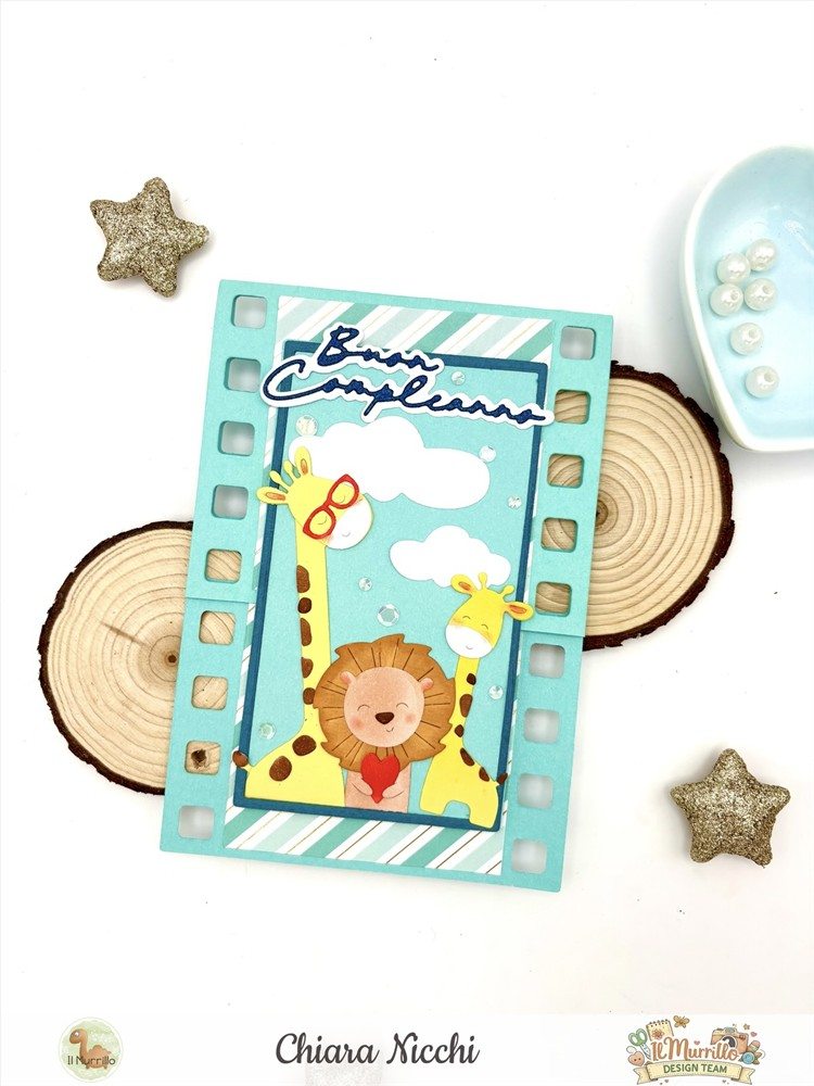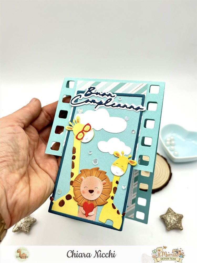 Materiali Utilizzati: Carte Monocolore – Carte con foil oro Lawn fawn – Fustella Effetto film – Fustella Giraffe e leone – Fustella Scrittine Delicate – Pennarelli Olo