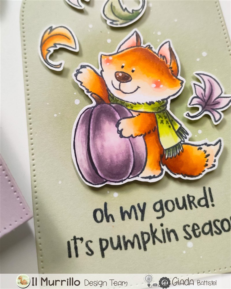 Dopo aver tolto la mascheratura ho sistemato con il pennarello Memento nero le linee del disegno mancanti e ho colorato i miei personaggi utilizzando gli OLO markers in una palette viola/arancio/verde suggerita dagli spettatori in diretta. Siccome sapevo che avrei avuto bisogno di altri elementi per riempire la mia tag, ho rubato le foglioline al set di timbri Foxy Adventure di Impronte d’Autore e le ho colorate con le stesse sfumature.