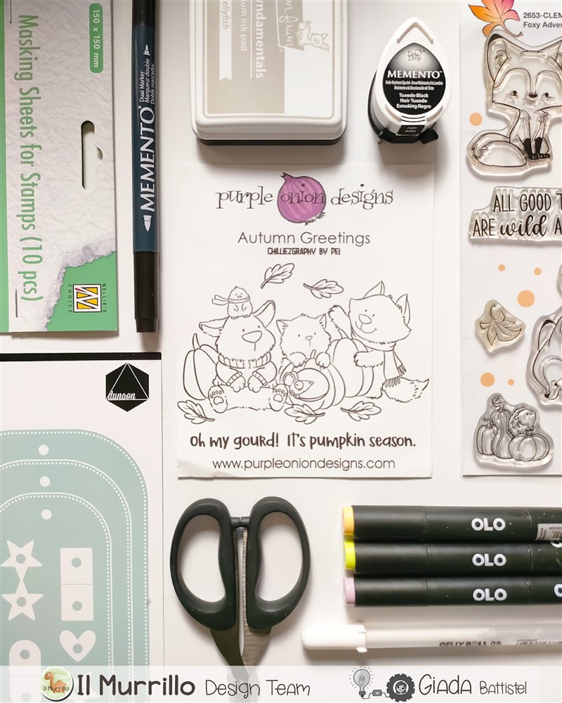 Materiali Utilizzati: Timbro Purple Onion Designs – Carta per Marker – Jellyfish Lawn Fawn – Lost Shadow Distress Ink – Masking Paper Nellie’s Choice – Tampone Memento Nero – Pennarello Memento nero – OLO markers – Timbro Impronte d’Autore – Tag Dunaon – Carte Modascrap – Biadesivo Spessorato