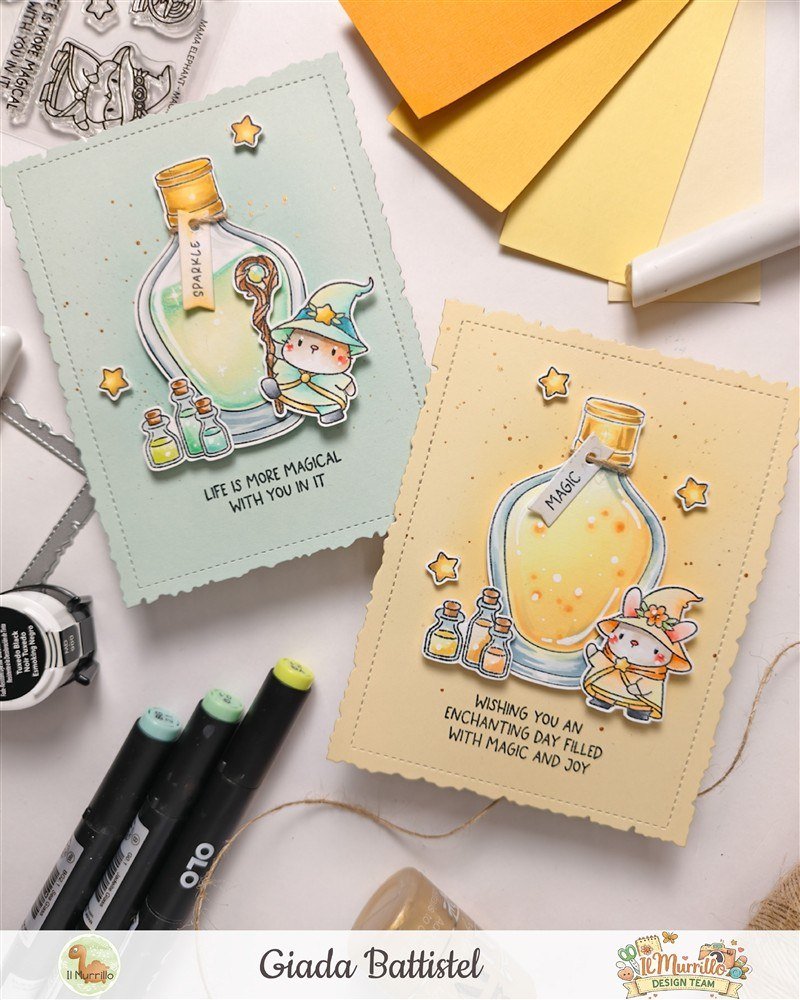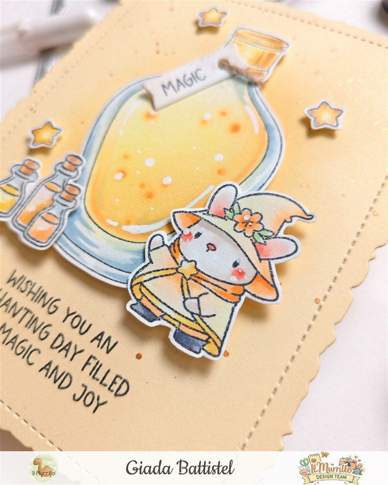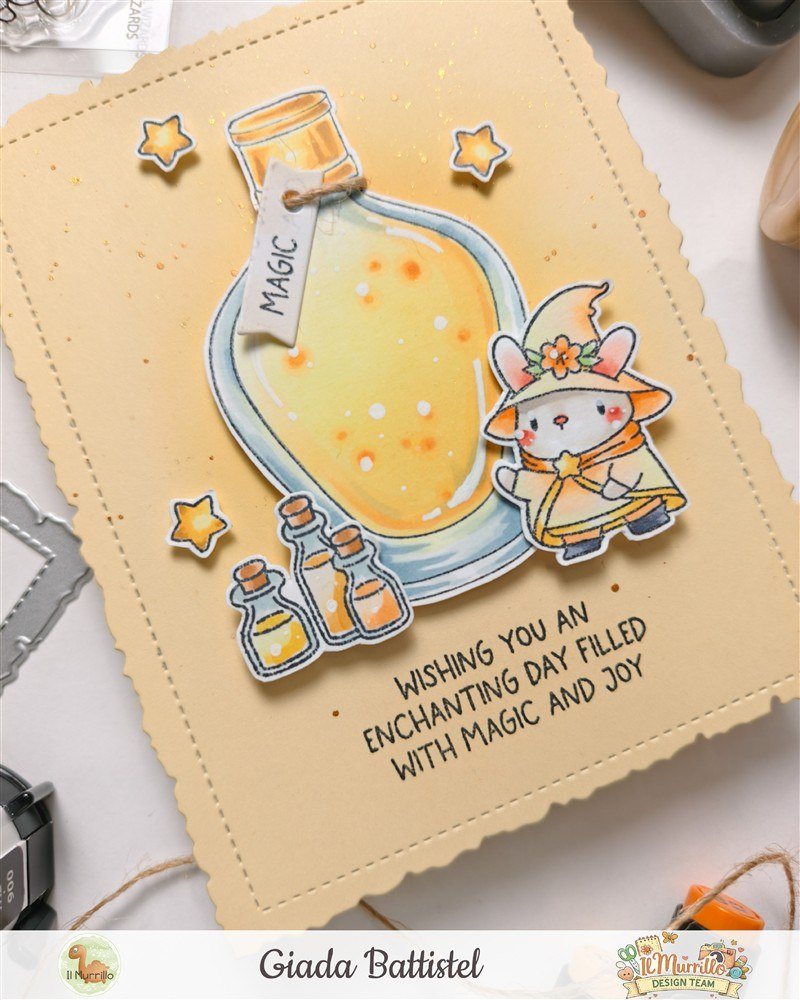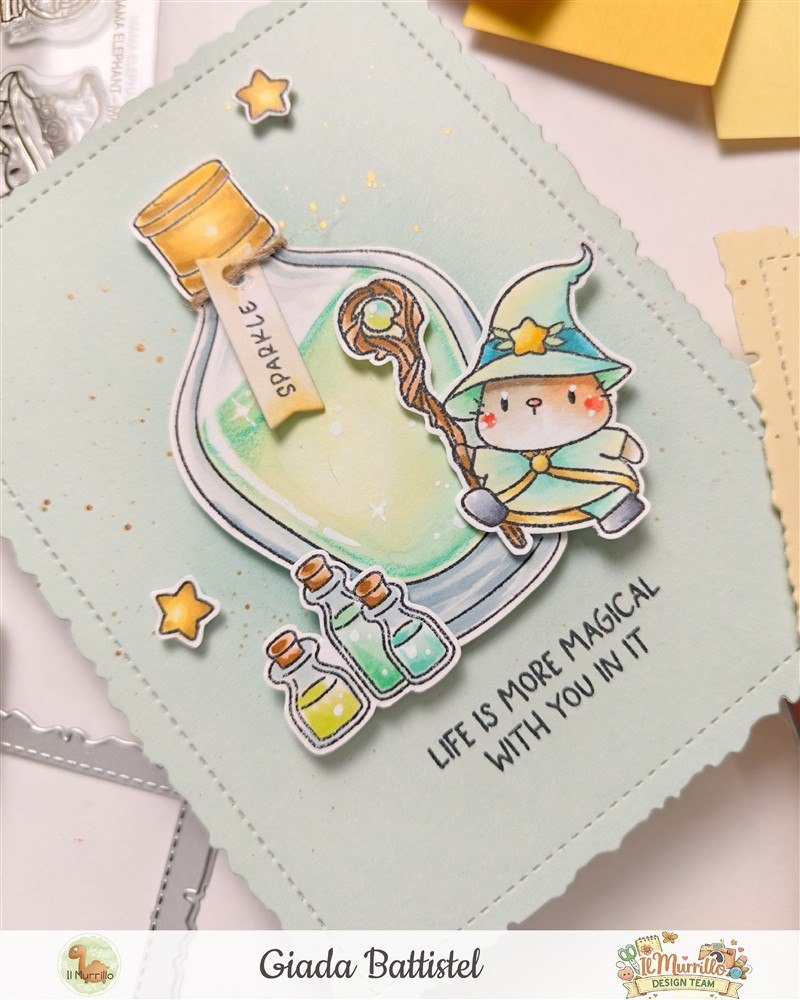 Nonostante sia bellissima anche come profumo, appena ho visto quella bottiglietta ho subito pensato alle pozioni magiche e quindi mi sono fatta aiutare dai maghi del set Magical Wizards di Mama Elephant per costruire una piccola scena.