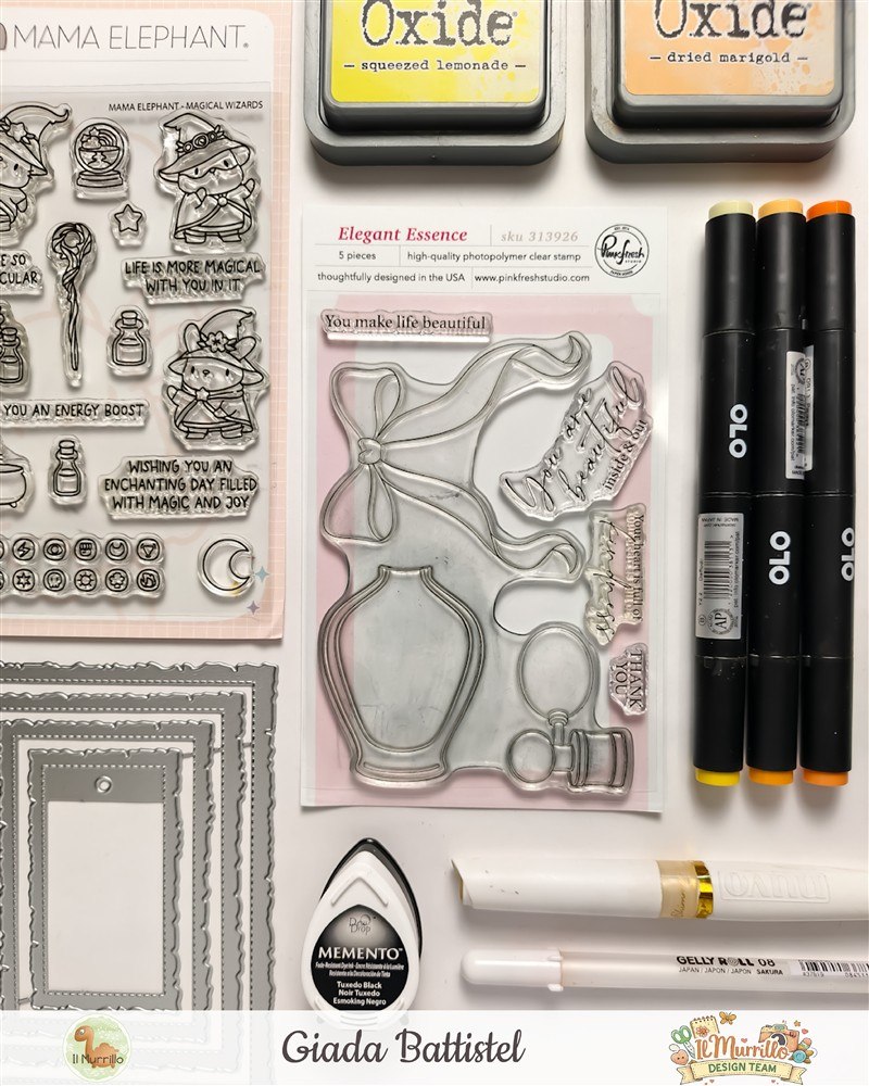 Materiali Utilizzati: Timbro Pinkfresh StudioTimbro Mama ElephantTampone Memento Tuxedo BlackCarta da Markerpenna MementoDistress OxideOLO markersFustella Mama ElephantNuvo Midas TouchKuretake Jewel Box