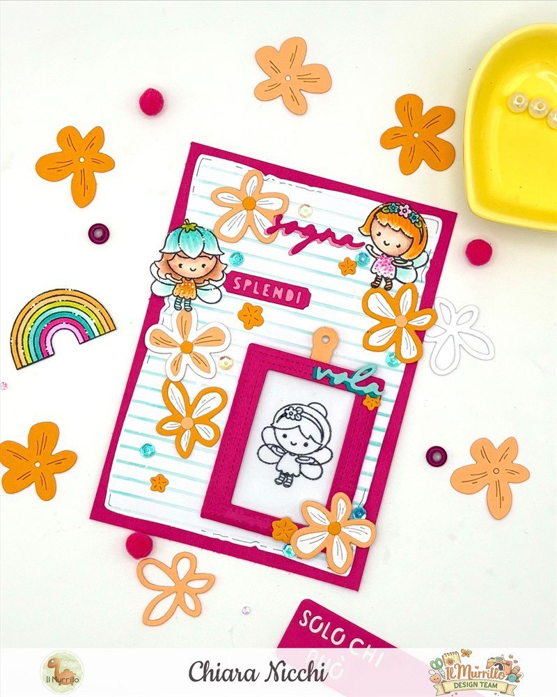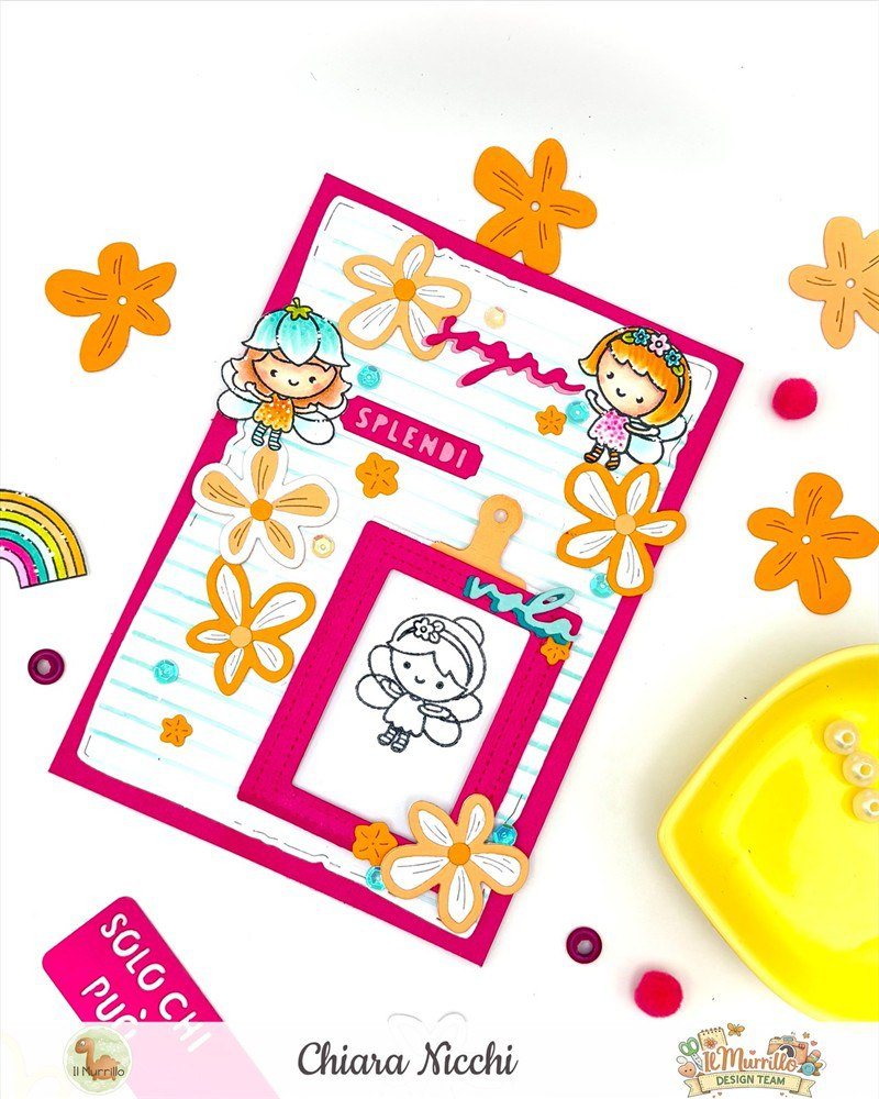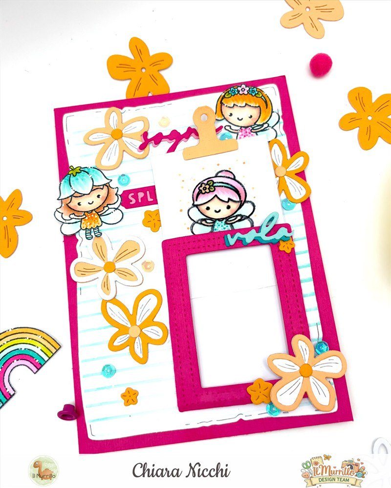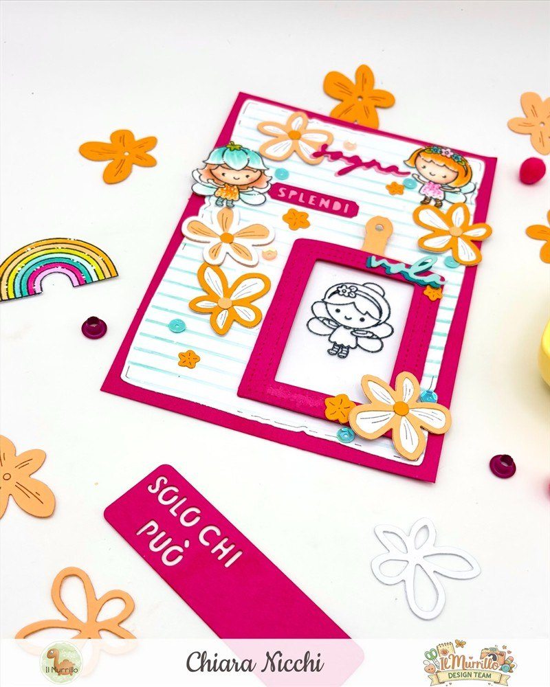 Mi sono poi occupata di costruire la taschina e le scritte fustellando il cartoncino color raspberry e successivamente ho timbrato con il memento nero le fatine prima su carta per marker e poi una invece l’ho timbrata con lo stazon su acetato e ripulito subito il timbro con il pulitore.