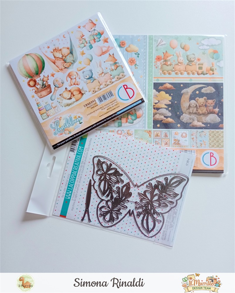 Ho abbinato alla farfalla le nuove carte di Ciao Bella “Lunibloom”, una collezione baby davvero stupenda e tra i ritagliabili ci sono tantissimi animaletti dolcissimi per abbellire i nostri lavori!! In più ho aggiunto qualche enamel dots qua e là e i sentiments della fustella “Mini album ticket” della Coppia Creativa, davvero super versatili 🙂