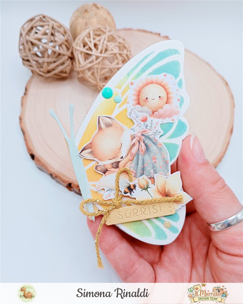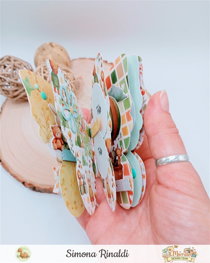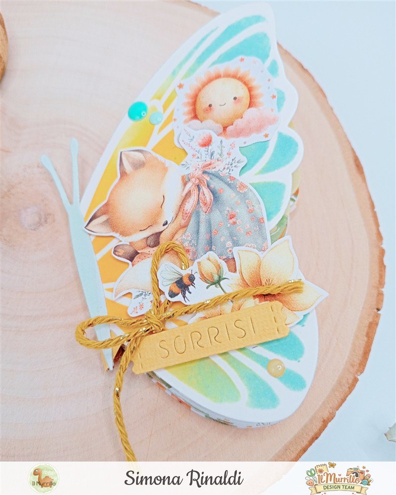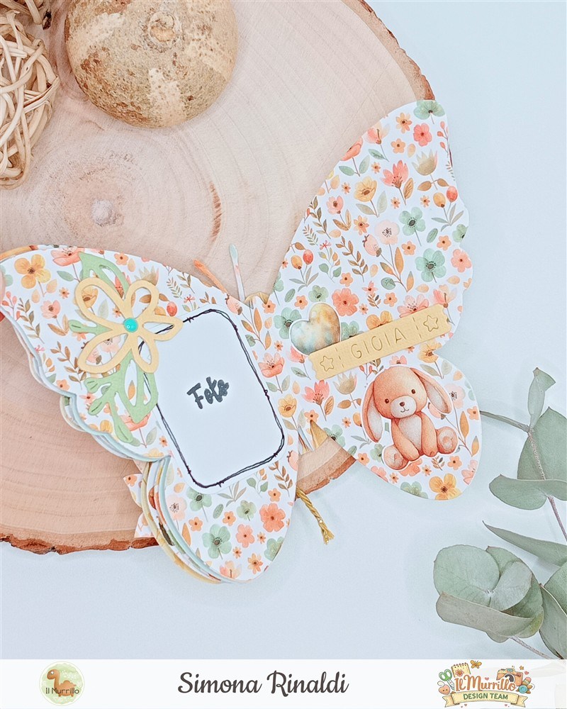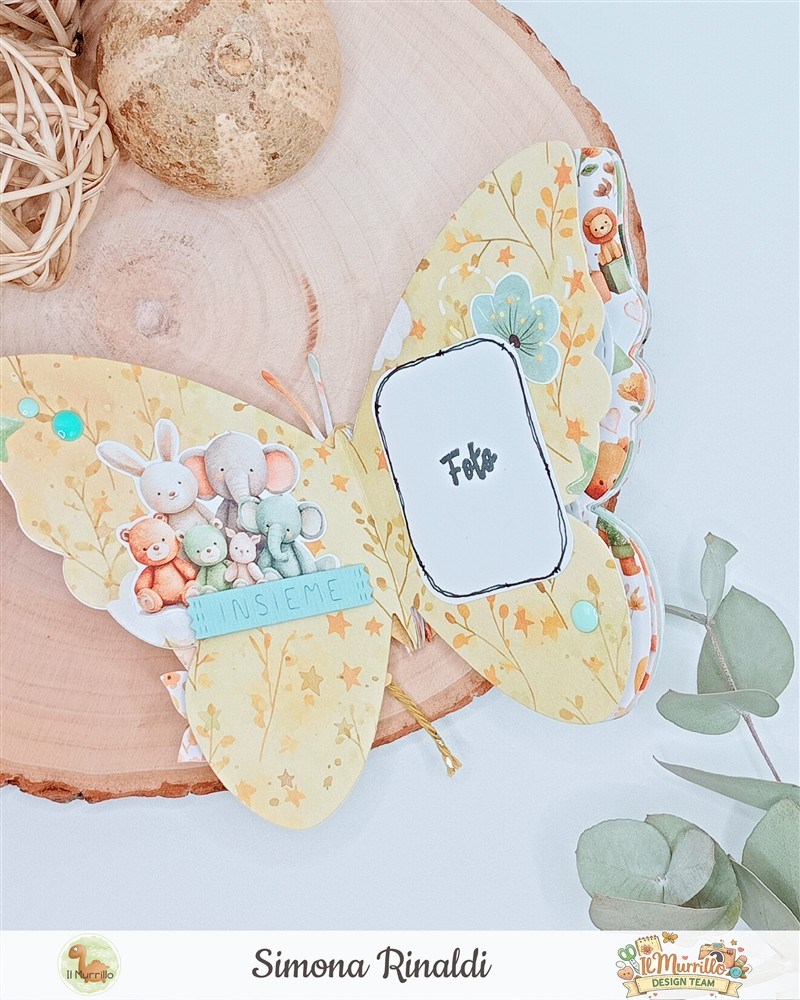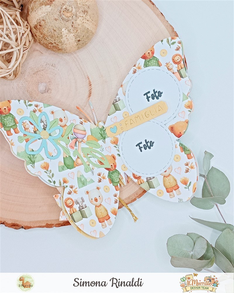 Ho abbinato alla farfalla le nuove carte di Ciao Bella “Lunibloom”, una collezione baby davvero stupenda e tra i ritagliabili ci sono tantissimi animaletti dolcissimi per abbellire i nostri lavori!! In più ho aggiunto qualche enamel dots qua e là e i sentiments della fustella “Mini album ticket” della Coppia Creativa, davvero super versatili 🙂