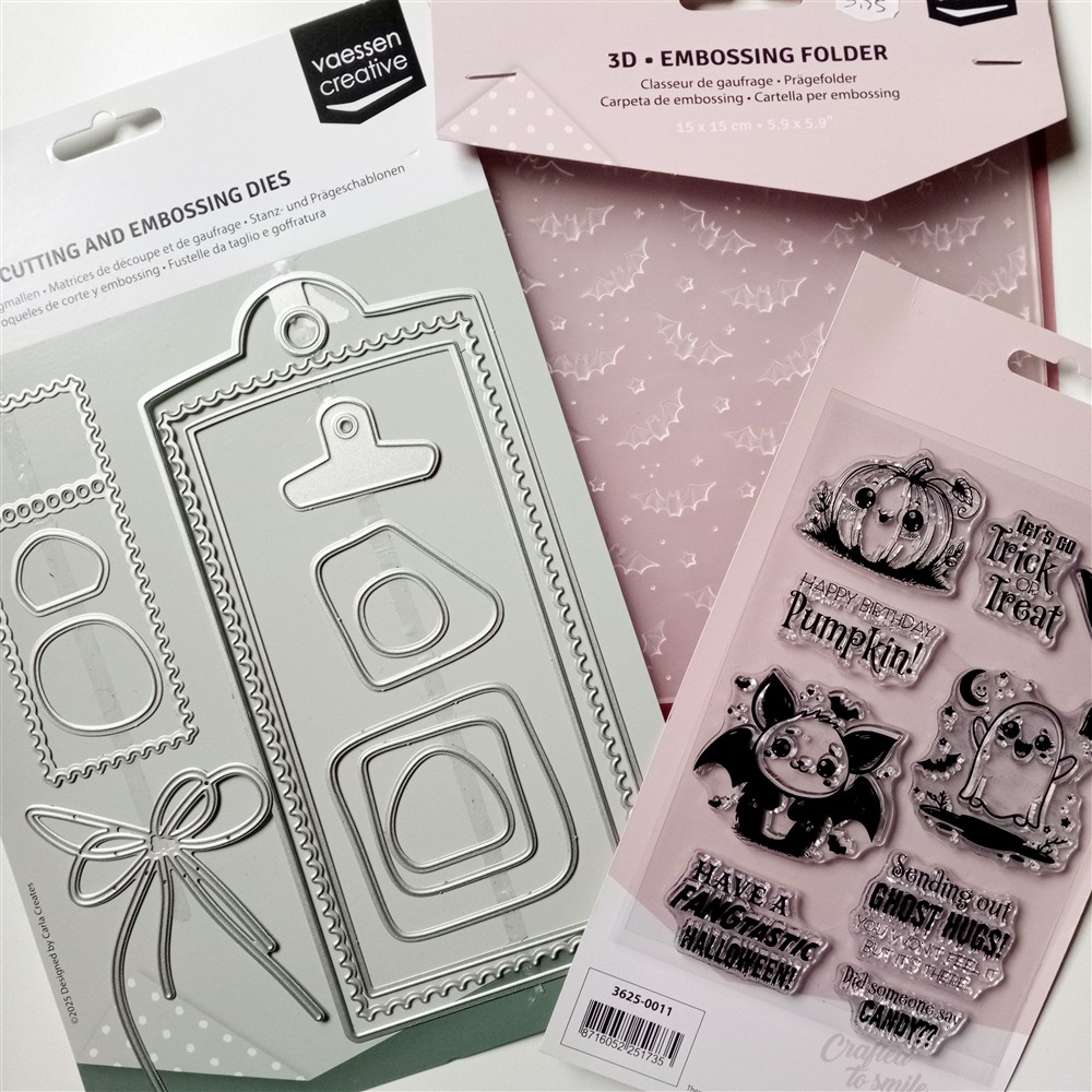 Materiali utilizzati: Fustella “Tag grande” Vaessen creativeEmbossing folder pipistrelli Vaessen creativeTimbro “trick or treat” Vaessen creative