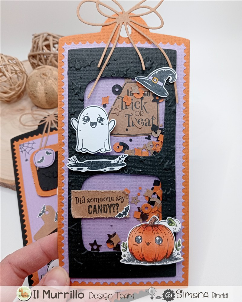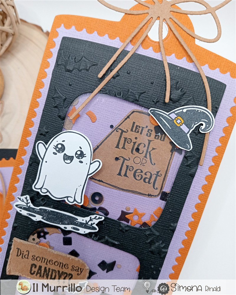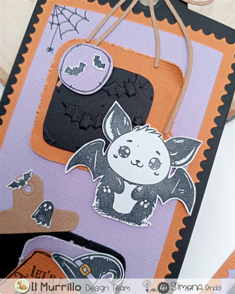 Materiali utilizzati: Fustella “Tag grande” Vaessen creativeEmbossing folder pipistrelli Vaessen creativeTimbro “trick or treat” Vaessen creative