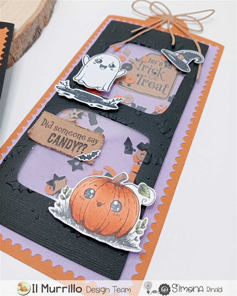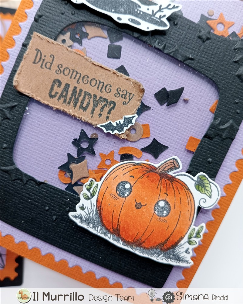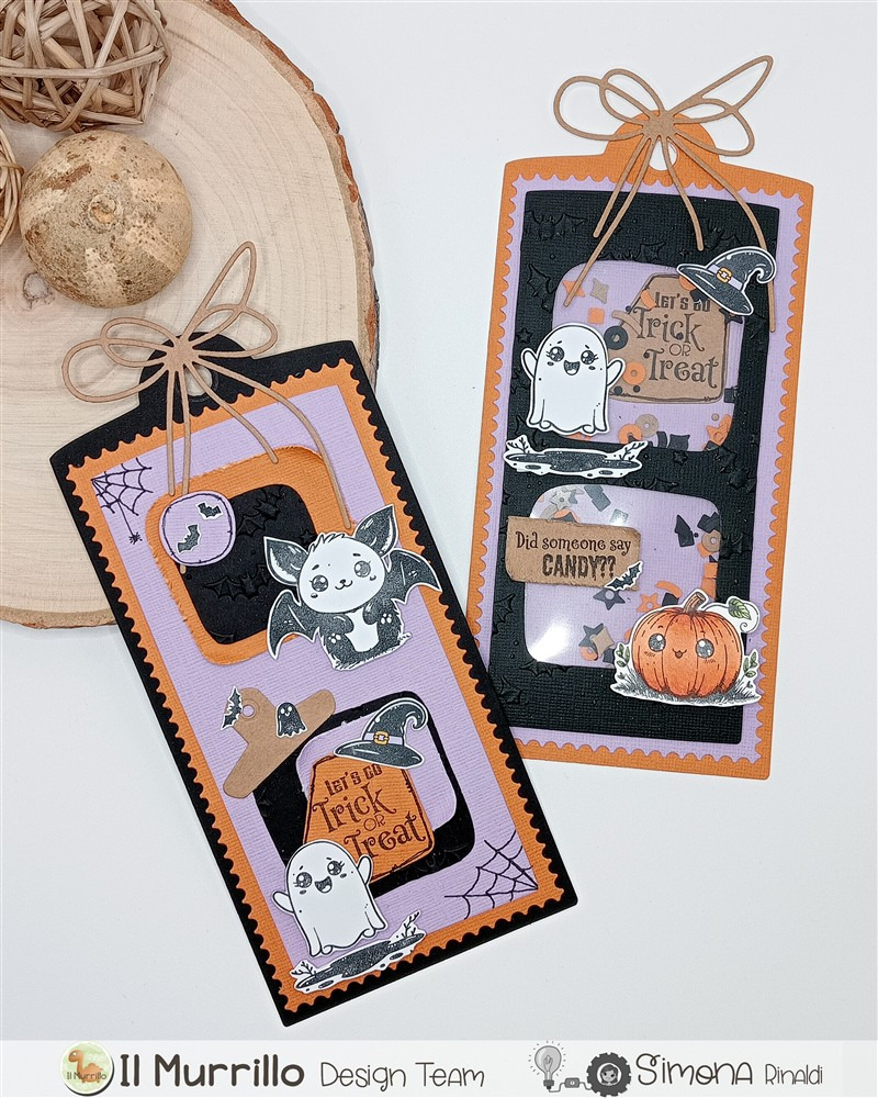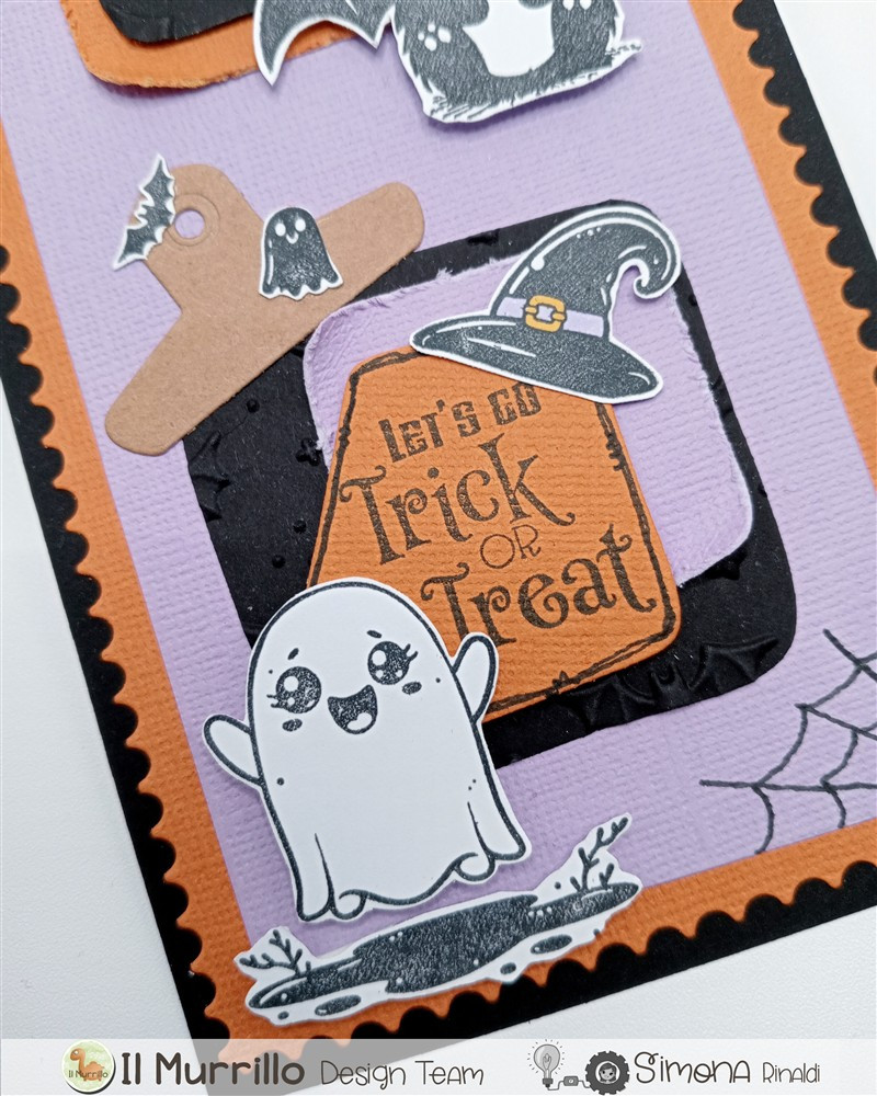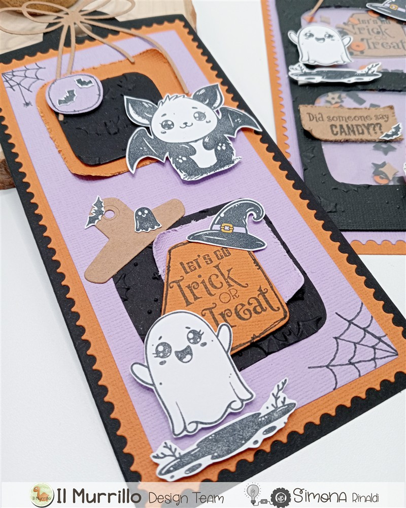 Per decorare entrambe le card ho utilizzato i timbri “Trick or treat” e l’embossing folder pipistrelli, entrambi di Vaessen creative e devo dire che sono abbastanza soddisfatta di come sono venute!!