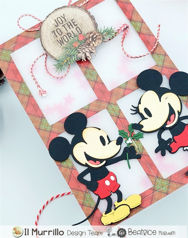Per la shaker ho usato le stesse misure dei fogli di base, ma questa volta alle ante ho tagliato la parte centrale proprio come per le finestre e ho messo del vellum così da dare l’effetto vedo non vedo. Ho spessorato e inserito le pailettes e questa volta oltre i die cut ho usato la fustella di topolino della Spellbinders.